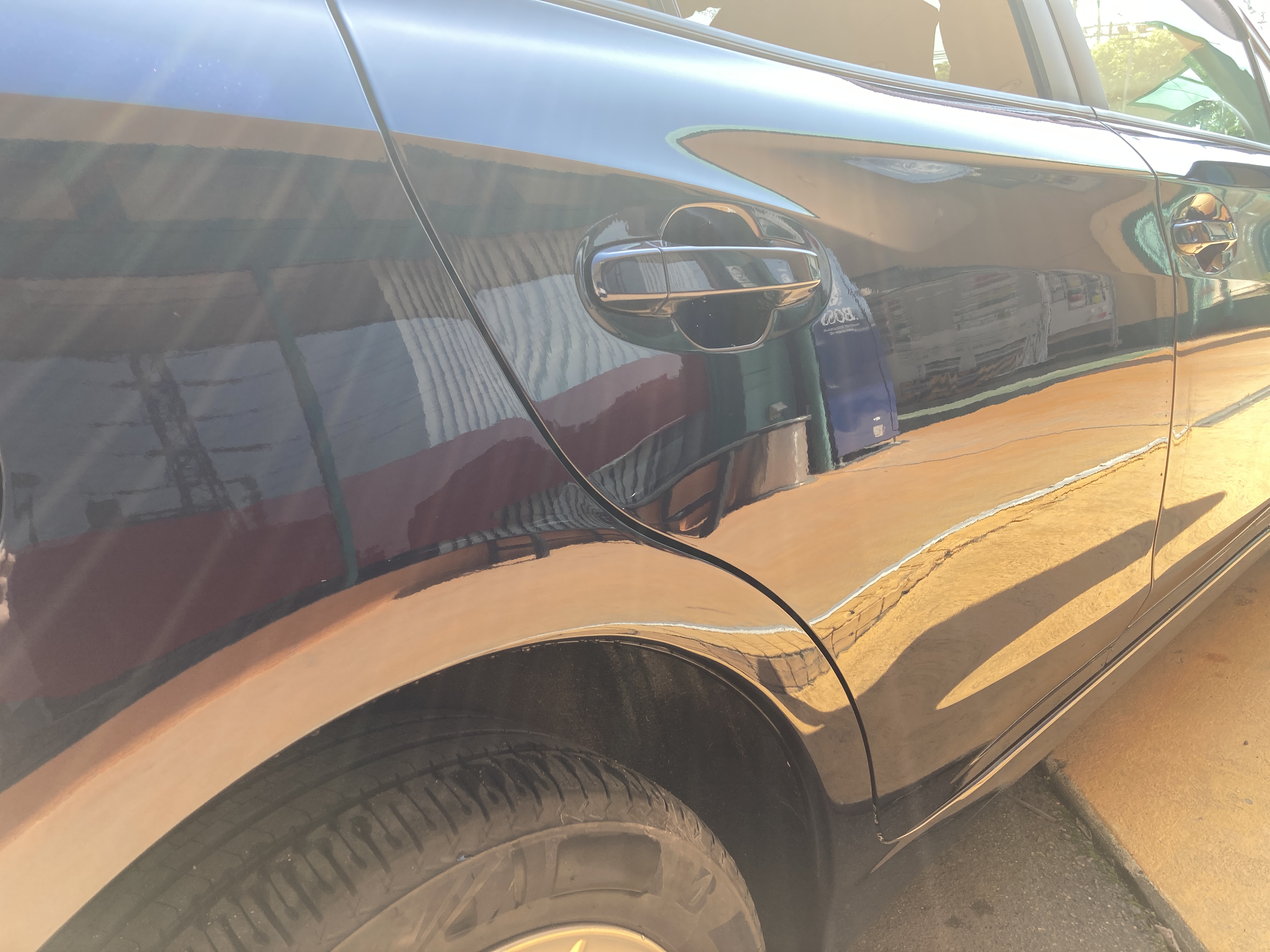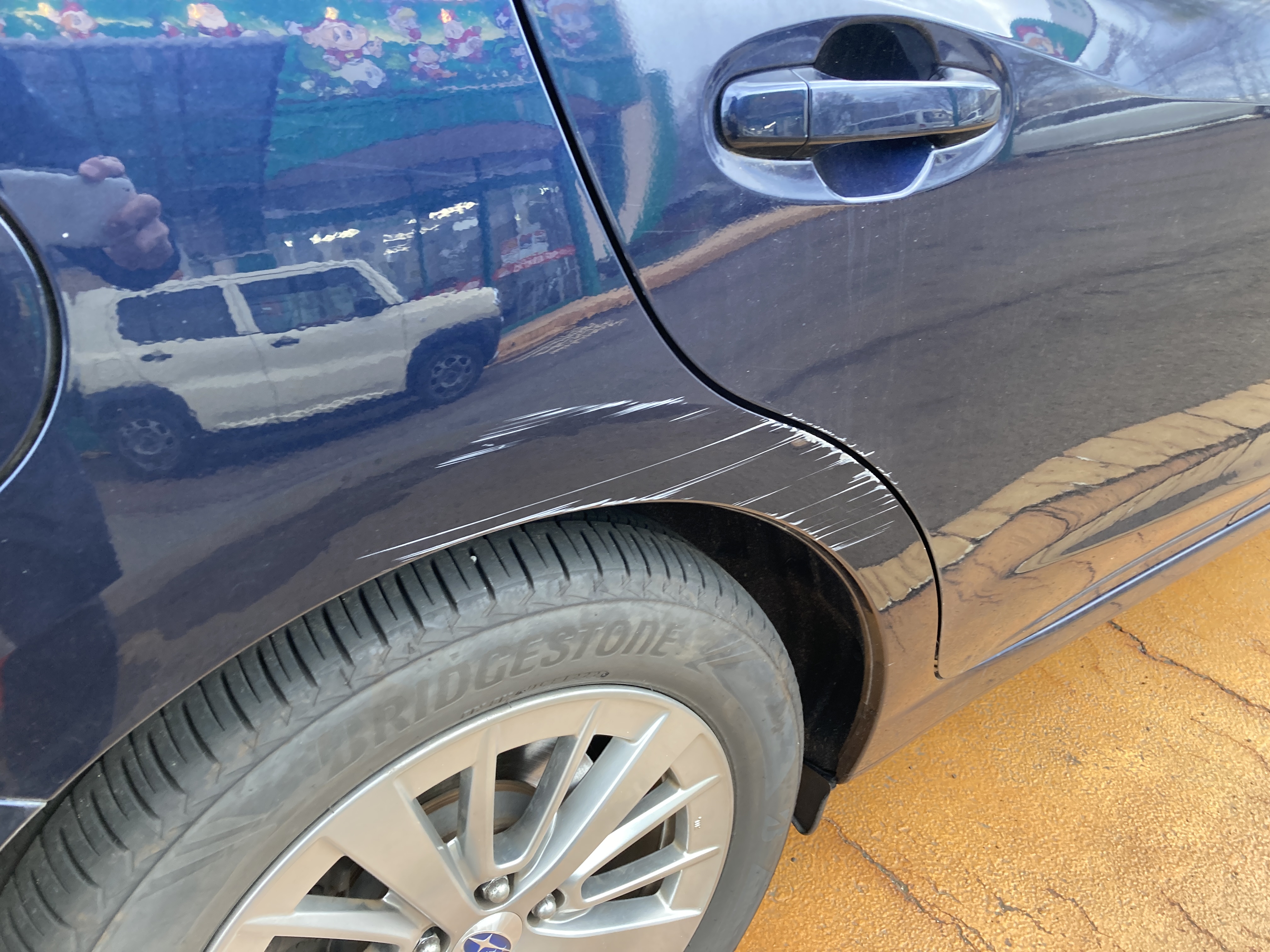 自宅駐車場にて縁石にこすってしまい、リヤドア・リヤフェンダーにキズヘコミが出来てしまいました。しっかりとヘコミを修理、再塗装を施して修理完了になります。どこがキズついていたか分からない仕上りになりました。